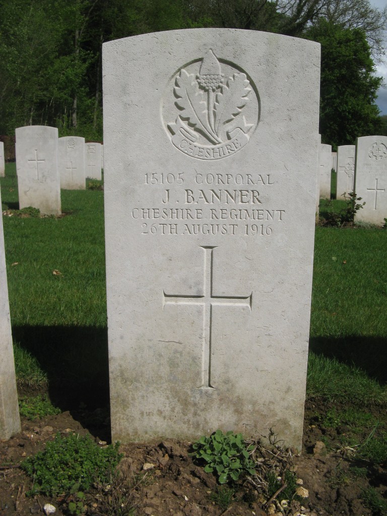 26/08/1916 Corporal James Banner 10th Bn. Blighty Valley Cemetery, Authuille Wood, Somme France. ‘15105’ (pic from findagrave.com. – with thanks)