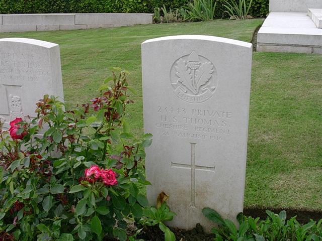 26/08/1916 Private Henry (S?) Thomas (Age 19) 13th Bn. Forceville Communal Cemetery and Extension, Somme France. ‘23443’ Son of Henry Samuel and Esther Matilda Thomas, of 33, Bessemer Street, Toxteth Park, Liverpool. (pic from findagrave.com. – with thanks)