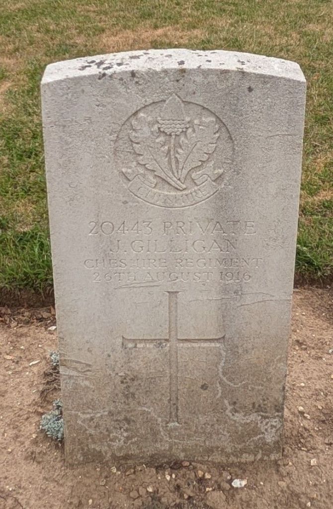 26/08/1916 Private John Gilligan 16th Bn. Abbeville Communal Cemetery, Somme France. ‘20443’ (pic from findagrave.com. – with thanks)