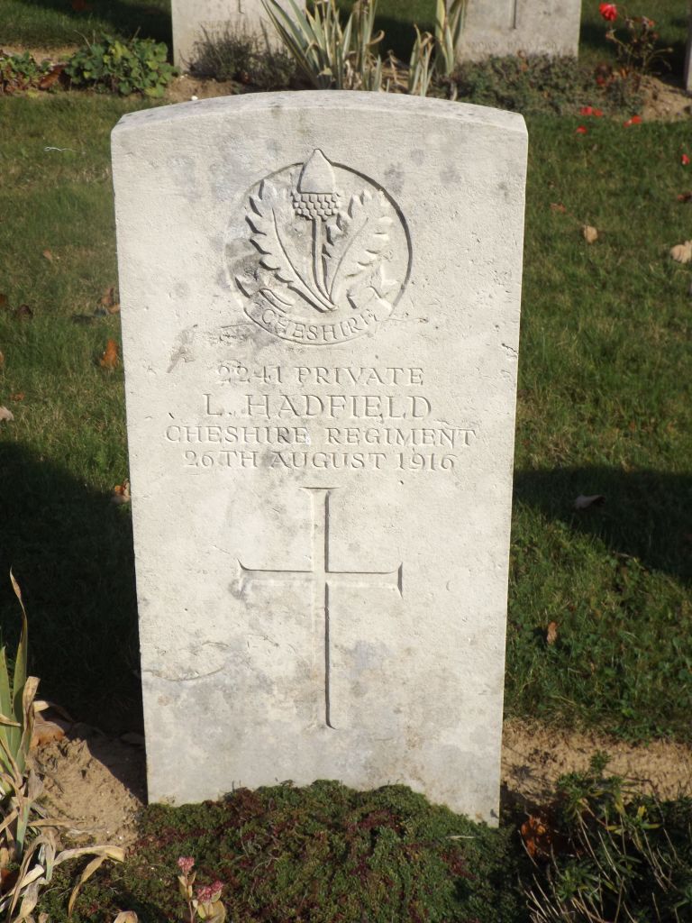 26/08/1916 Private Louis Hadfield 1st/6th Bn. Knightsbridge Cemetery, Mesnil-Martinsart, Somme France. ‘2241’ (pic from findagrave.com. – with thanks)