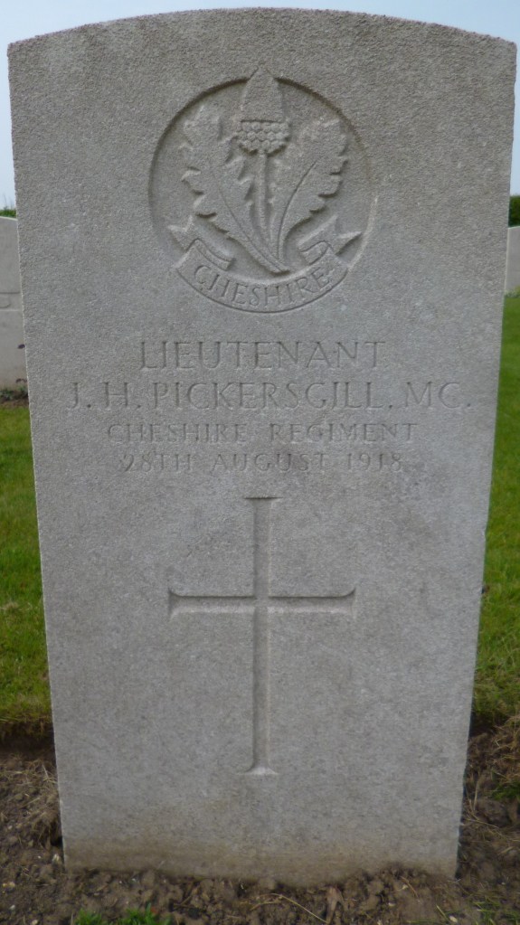 28/08/1918 Lieutenant John Henry Pickersgill (Age 27) MC 10th Bn. attd. 1st/6th Bn. Godewaersvelde British Cemetery, Nord France. Son of George Denis and Margaret Ellen Pickersgill, of 101, St. John’s Park, Blackheath, London. (pic from findagrave.com. – with thanks)