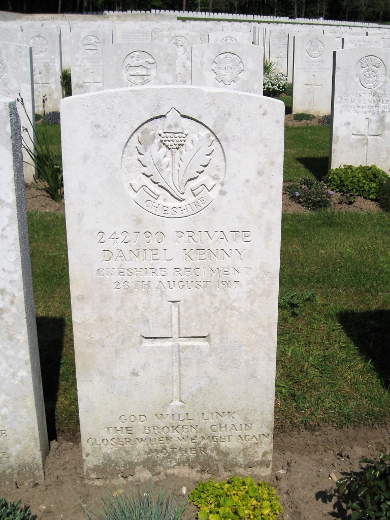 28/08/1917 Private Daniel Kenny (Age 29) 10th Bn. Etaples Military Cemetery, Pas de Calais France. ‘242790’ Son of Patrick and Hannah Kenny, of 16, Brook St., Chadderton, Lancs. Native of Oldham, Lancs. (pic from findagrave.com. – with thanks)