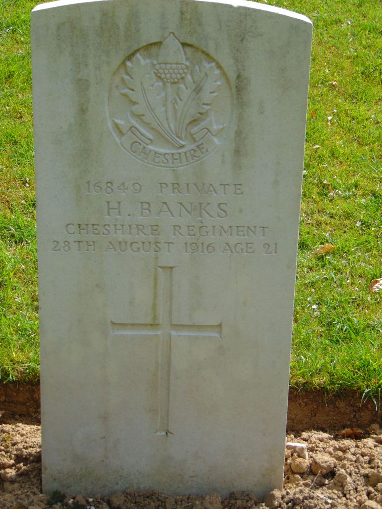 28/08/1916 Private Harry Banks (Age 21) 11th Bn. Authuile Military Cemetery, Somme France. ‘16849’ Son of Richard E. Banks, of 12, Russell Rd., Wallasey,. (pic from findagrave.com. – with thanks)