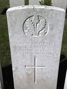 1/09/1916 Corporal Reuben Smith (Age 21) 1st Bn. Guillemont Road Cemetery, Guillemont, Somme France. ‘10398’ Son of Frank and Frances Smith, of 83, Old Bidston Rd., Birkenhead. (pic from findagrave.com. – with thanks)