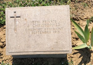 1/09/1915 Private James Christopher (Age 21) 8th Bn. East Mudros Military Cemetery, Greece. ‘10781’ Son of Samuel and Annie Christopher, of Station Rd., Cuddington, Northwich, Cheshire. (pic from findagrave.com. – with thanks)