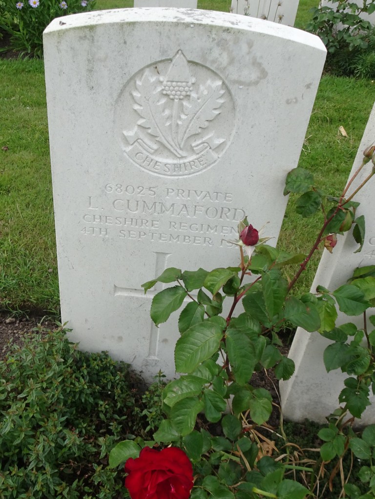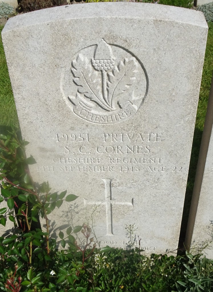 4/09/1918 Private Stanley Clifford Cornes (Age 22) 1st/4th Bn. Lijssenthoek Military Cemetery, West-Vlaanderen Belgium. ‘49951’ Son of Peter and Eva May Cornes, of Crewe, Cheshire.