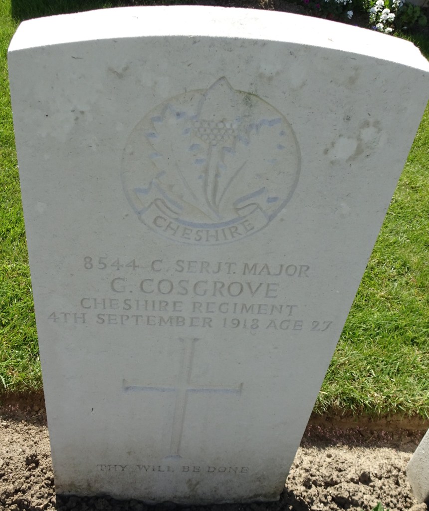 4/09/1918 Company Serjeant Major George Cosgrove (Age 27) 1st/4th Bn. Wytschaete Military Cemetery, West-Vlaanderen Belgium. ‘8544’ Husband of Sadie Cosgrove. of Ivy Cottage, Mold Rd., Giverszilt, Wrexham.