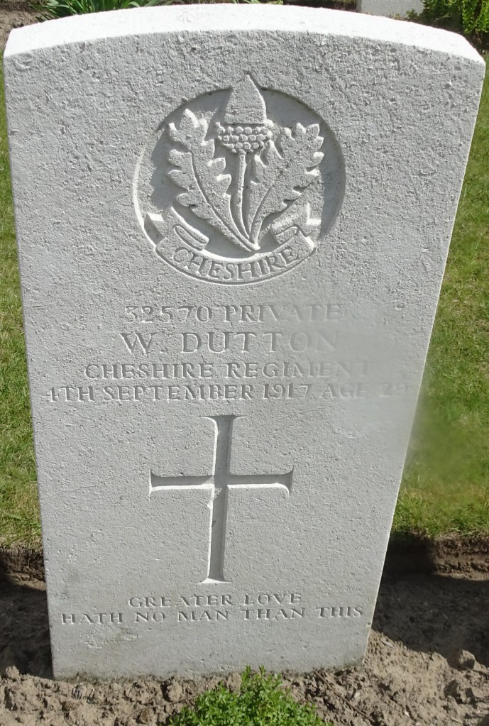 4/09/1917 Private William Dutton (Age 29) 6th Bn. Voormezeele Enclosures No.1 and No.2, West-Vlaanderen Belgium. ‘32570’ Son of Samuel and Mary Hannah Dutton, of Acton Bridge, Northwich.