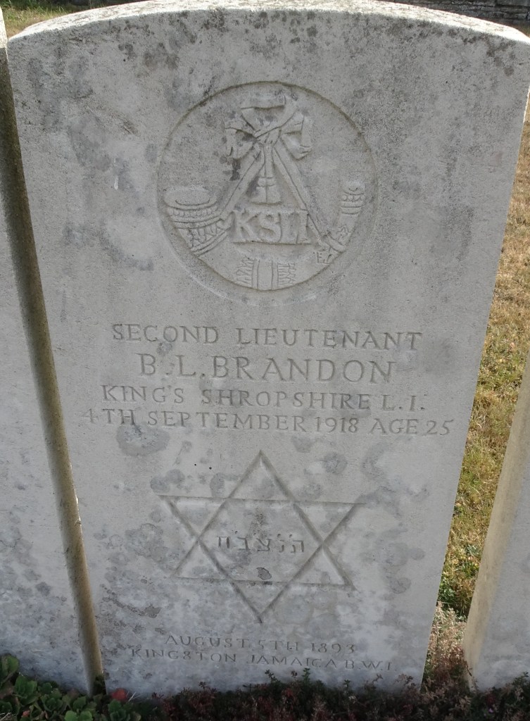 4/09/1918 Second Lieutenant Brian Lloyd Brandon (Age 25) 7th Pond Farm Cemetery, West-Vlaanderen Belgium. Son of Jacob and Leah Brandon, of Kingston, Jamaica, British West Indies.