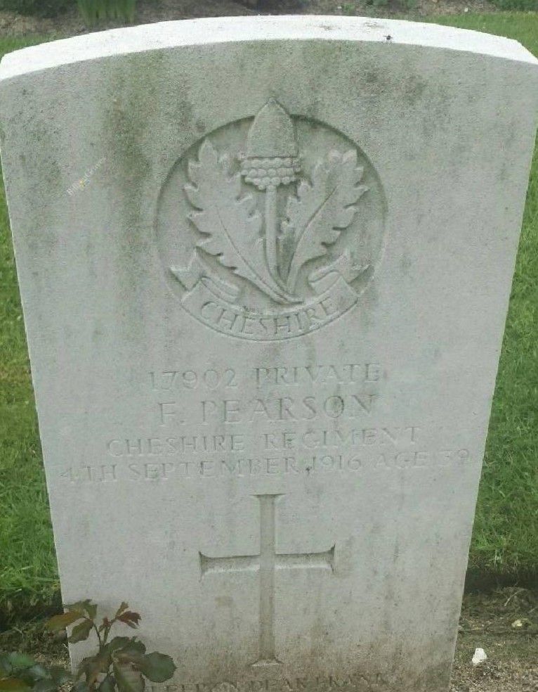4/09/1916 Private Frank Pearson (Age 39) 11th Bn. Ancre British Cemetery, Beaumont-Hamel, Somme France. ‘17902’ Son of Luke and Mary Pearson; husband of Annie Louisa Pearson, of 63, Crescent Rd., Ellesmere Port, Birkenhead, Cheshire. (pic from findagrave.com. – with thanks)