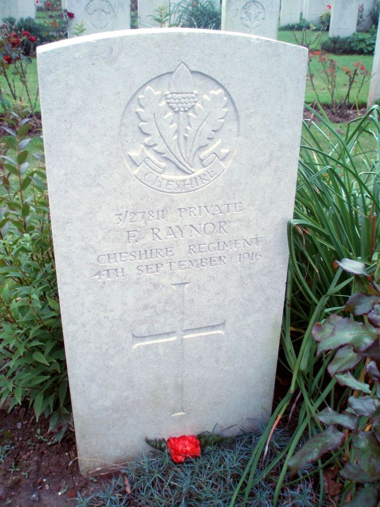 4/09/1916 Private Fred Raynor (Age 32) 1st Bn. Bronfay Farm Military Cemetery, Bray-Sur-Somme, Somme France. ‘27811’ Son of Thomas and Hannah Raynor, husband of Florence Raynor (nee Douglas) of Chester. (pic from findagrave.com. – with thanks)