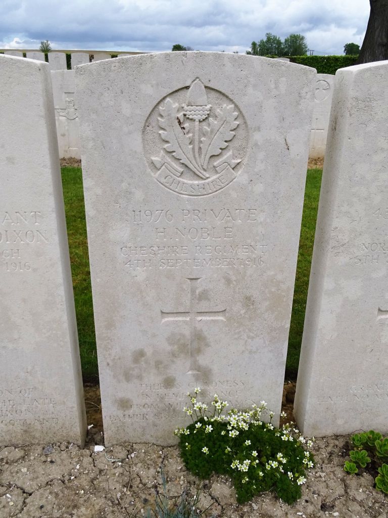 4/09/1916 Private Harry Noble (Age 28) 1st Bn. La Neuville British Cemetery, Corbie, Somme France. ‘11976’ Son of James and Hannah Mary Noble, of 89, Spring Bank St., Stalybridge; husband of Ethel Noble, of 149, Mottsam Moor, Hollingworth, Cheshire. (pic from findagrave.com. – with thanks)