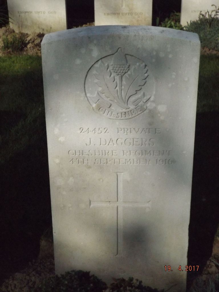 4/09/1916 Private Joseph Daggers 1st Bn. Delville Wood Cemetery, Longueval, Somme France. ‘24452’ (pic from findagrave.com. – with thanks)