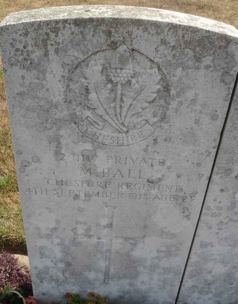 4/09/1918 Private Mark Ball (Age 22) 1st/7th Bn. Pond Farm Cemetery, West-Vlaanderen Belgium. ‘291117’ Son of Isaac and Sarah Ann Ball, of 19, Back St., Rookery, Stoke-on-Trent.