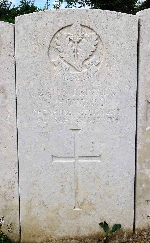 4/09/1916 Private Percy Howard 1st Bn. Corbie Communal Cemetery Extension, Somme France. ‘26113’ (pic from findagrave.com. – with thanks)