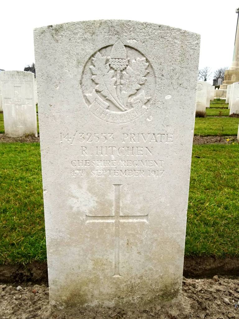 4/09/1917 Private Ralph Hitchen 13th Bn. Calais Southern Cemetery, Pas de Calais France. ’14/32553′ (pic from findagrave.com. – with thanks)