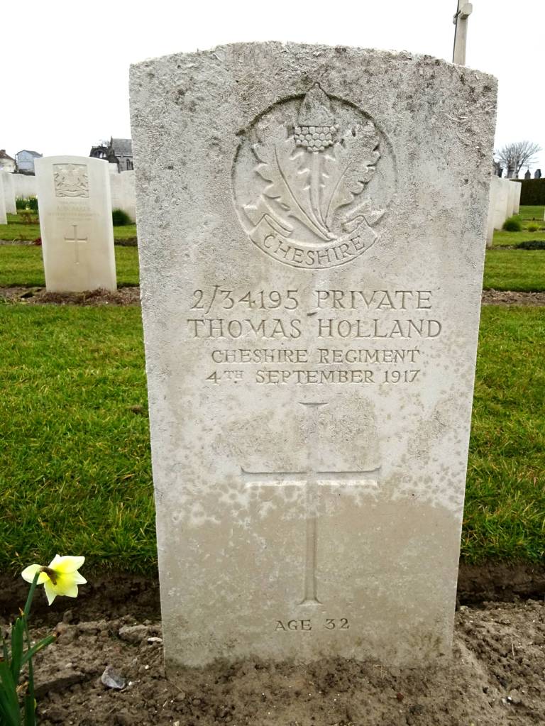 4/09/1917 Private Thomas Holland (Age 32) 10th Bn. Calais Southern Cemetery, Pas de Calais France. ‘2/34195’ Husband of Ann Holland, of 3, Hilton Terrace, Heyside, Royton, Oldham. (pic from findagrave.com. – with thanks)
