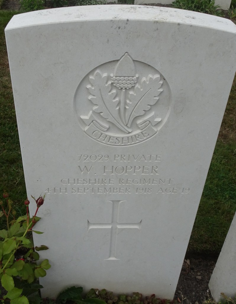 4/09/1918 Private William Hopper (Age 19) 1st/5th Bn. La Clytte Military Cemetery, West-Vlaanderen Belgium. ‘72029’ Son of Mary Jane Paterson, of 56, Eldon St., Birkenhead, Cheshire.