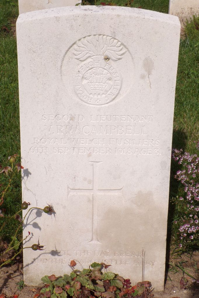6/09/1918 Second Lieutenant Victor Robert Wilkie Campbell (Age 31) 23rd Pont-De-Nieppe Communal Cemetery, Nord France. Son of Donald and Margaret Campbell, of Mavisbank, Callander, Perthshire. (pic from findagrave.com. – with thanks)