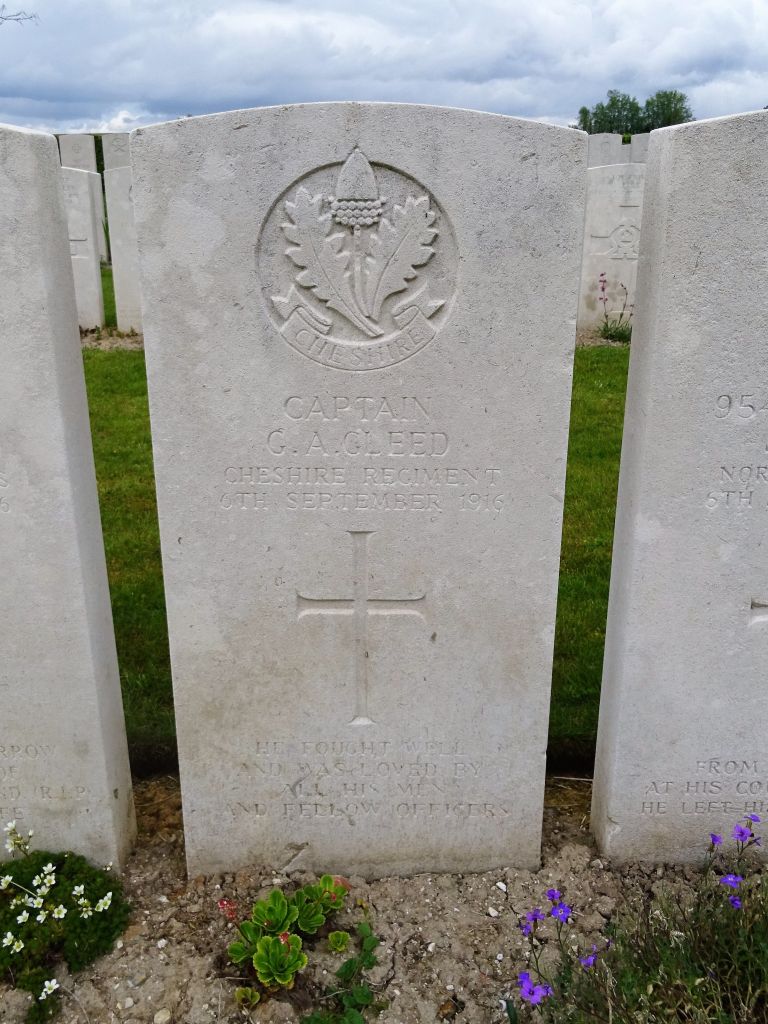6/09/1916 Captain George Alfred Gleed (Age 26) MID 1st Bn. La Neuville British Cemetery, Corbie, Somme France. Son of George Mark and Agnes Frances Gleed, of London. (pic from findagrave.com. – with thanks)