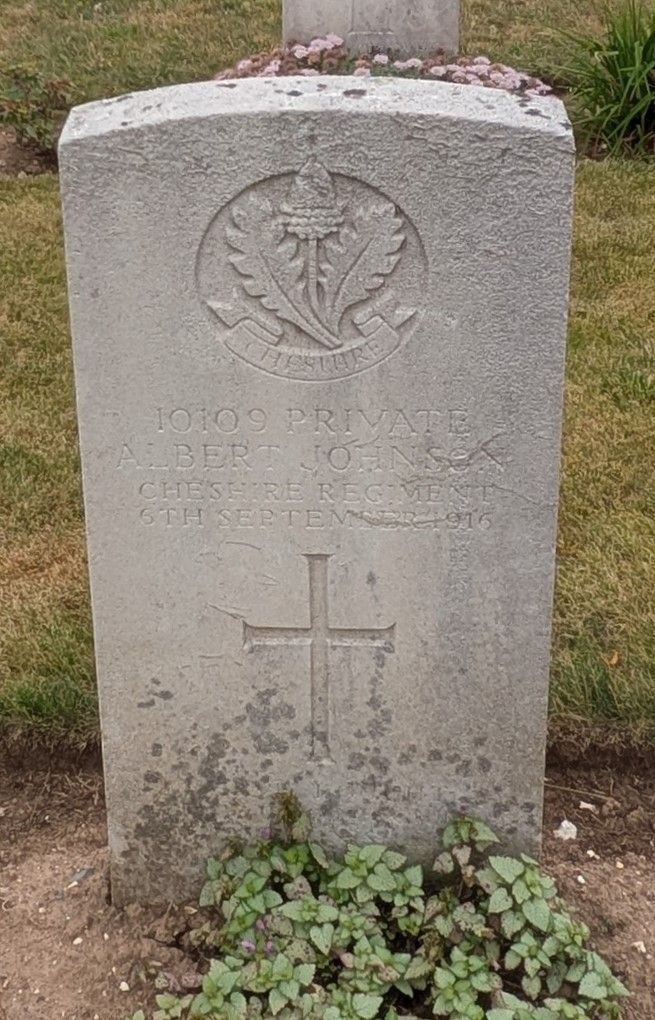 6/09/1916 Private Albert Johnson (Age 27) 1st Bn. Abbeville Communal Cemetery, Somme France. ‘10109’ Son of William H. and Sarah Ann Johnson, of Chester. (pic from findagrave.com. – with thanks)