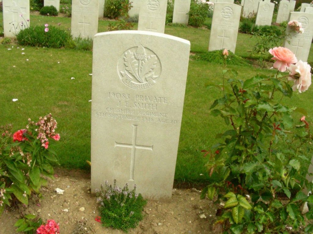 6/09/1916 Private James E. Smith (Age 20) 15th Bn. Faubourg D’amiens Cemetery, Arras, Pas de Calais France. ‘19083’ Son of Mrs. Martha Ann Jones, of 54, Napier Rd., New Ferry, Birkenhead. (pic from findagrave.com. – with thanks)
