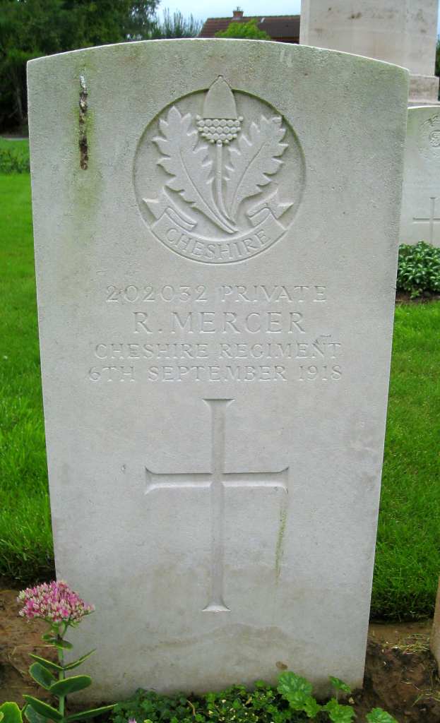 6/09/1918 Private Rowland Mercer (Age 20) 1st/7th Bn. Esquelbecq Military Cemetery, Nord France. ‘202032’ Son of George and Alice Mercer, of Little Saughall, Chester. (pic from findagrave.com. – with thanks)