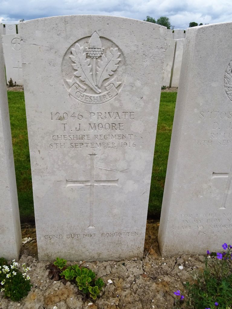 6/09/1916 Private Thomas Jubilee Moore (Age 29) 1st Bn. La Neuville British Cemetery, Corbie, Somme France. ‘12046’ Son of Jesse and Annie Moore, of Winnington Park, Northwich, Cheshire. (pic from findagrave.com. – with thanks) [29 in 1916, so born about 1887, hence middle name “Jubilee” for Queen Victoria’s Golden Jubilee]