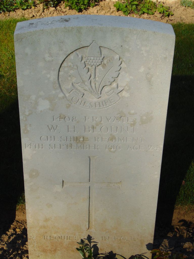 14/09/1916 Private William Herbert Blount (Age 24) 1st/5th Bn. Delville Wood Cemetery, Longueval, Somme France. ‘1408’ Son of Herbert Guy Blount and Annie Maria Blount, of 35, Hope Rd., Sale, Manchester. (pic from findagrave.com. – with thanks)