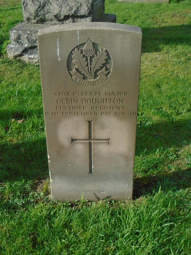 15/09/1917 Company Serjeant Major Olbin Houghton (Age 40) 4th Bn. Wallasey (Rake Lane) Cemetery, Cheshire United Kingdom. ‘5303’ Long Service and Good Conduct Medal. Husband of Elizabeth Houghton, of 38, Urmson Rd., Wallasey. (pic from findagrave.com. – with thanks)