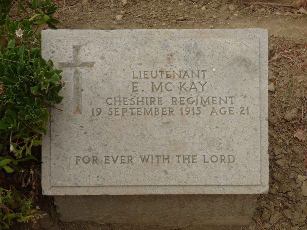 19/09/1915 Lieutenant Ernest McKay (Age 21) 1st/7th Bn. Azmak Cemetery, Suvla, Turkey (including Gallipoli). Son of Lt. R. H. McKay (Cheshire Regt.) and Mrs. M. A. McKay, of 202, Edgeley Rd., Stockport. (pic from findagrave.com. – with thanks)