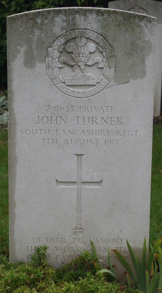19/09/1915 Private John Turner (Age 21) 9th Bn. Merville Communal Cemetery, Nord France. ‘12869’ Son of Rose H. Burt (formerly Turner), of 23, Colclough St., Talke Pitts, Staffs., and the late John Turner. Native of Macclesfield. (pic from findagrave.com. – with thanks)