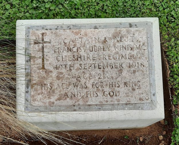 19/09/1918 Captain Francis Aubrey Ninis (Age 21) MC, MID 12th Bn. Sarigol Military Cemetery, Kriston, Greece. Son of A. Longley Ninis, of 26, Sefton Rd., Parkfield, New Ferry, Cheshire. (pic from findagrave.com. – with thanks)