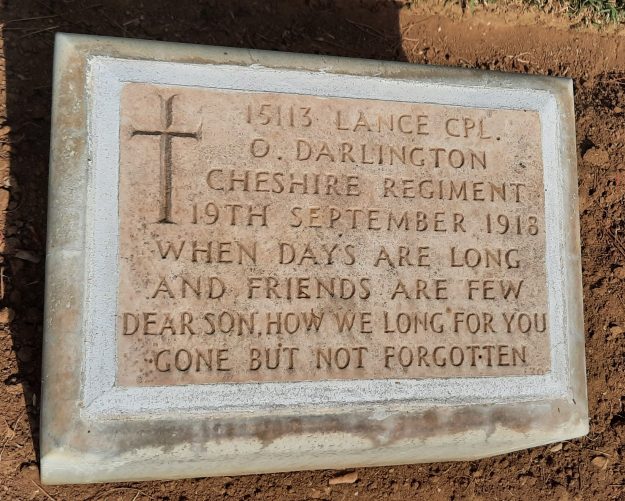 19/09/1918 Lance Corporal Oswald Darlington (Age 22) 12th Bn. Karasouli Military Cemetery, Greece. ‘15113’ Son of Richard John and Mary Ann Darlington, of 68, Oakland St., Widnes, Lancs. (pic from findagrave.com. – with thanks)