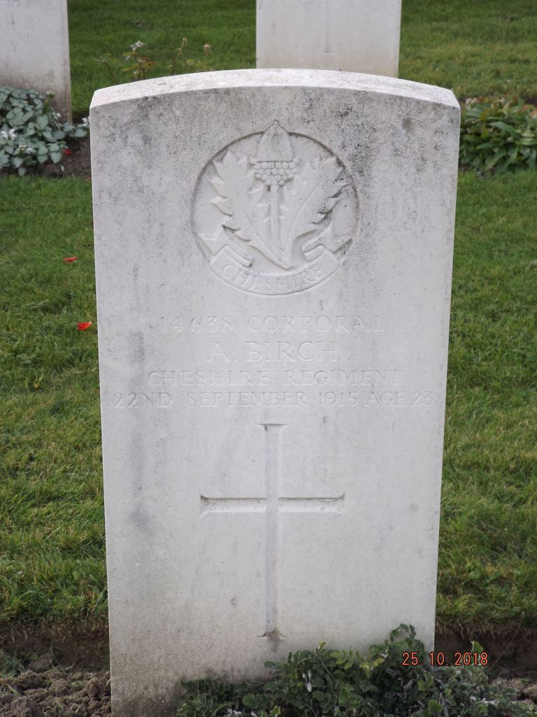 22/09/1915 Corporal Albert Birch (Age 23) 9th Bn. Brown’s Road Military Cemetery, Festubert, Pas de Calais France. ‘14638’ Son of Mrs. Julia Birch, of 3, Chatham St., Macclesfield, Cheshire. (pic from findagrave.com. – with thanks)