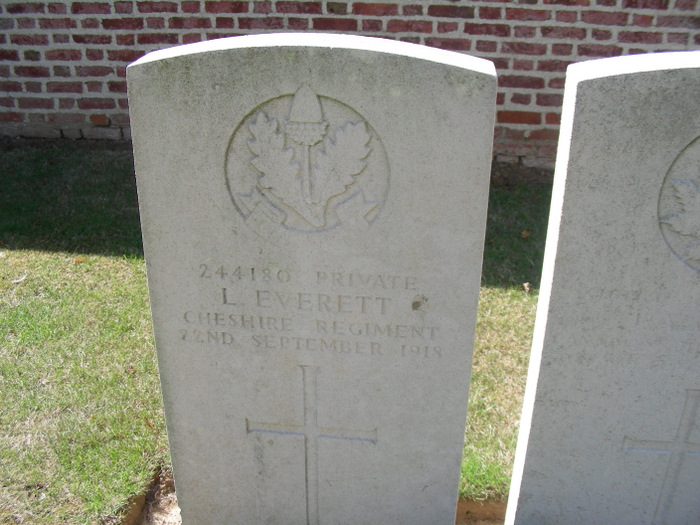 22/09/1918 Private Laurence Everett 1st/5th Bn. Dury Mill British Cemetery, Pas de Calais France. ‘244180’ (pic from findagrave.com. – with thanks)