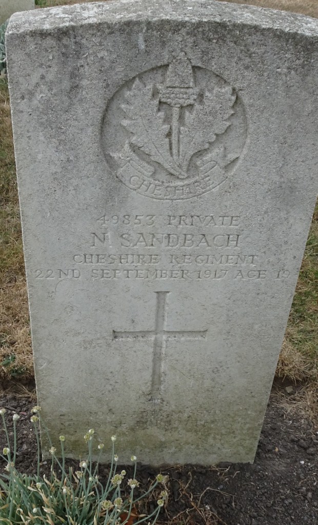 22/09/1917 Private Nathan Sandbach (Age 19) 6th Bn. Reninghelst New Military Cemetery, West-Vlaanderen Belgium. ‘49853’ Son of Thomas and Mary Sandbach, of 5, Queen St., Northwich, Cheshire.