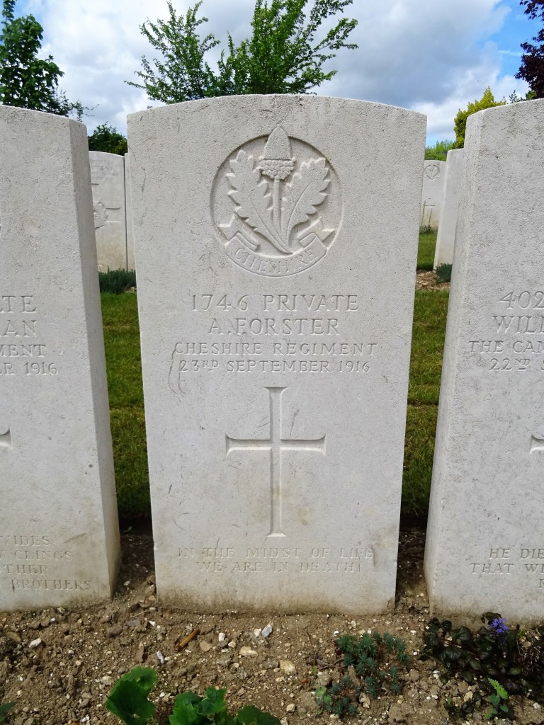 23/09/1916 Private Arthur Forster (Age 20) 1st/5th Bn. Corbie Communal Cemetery Extension, Somme France. ‘1746’ Son of Samuel and Mary Forster, of 8, Ryder Street, Castle, Northwich, Cheshire. (pic from findagrave.com. – with thanks)