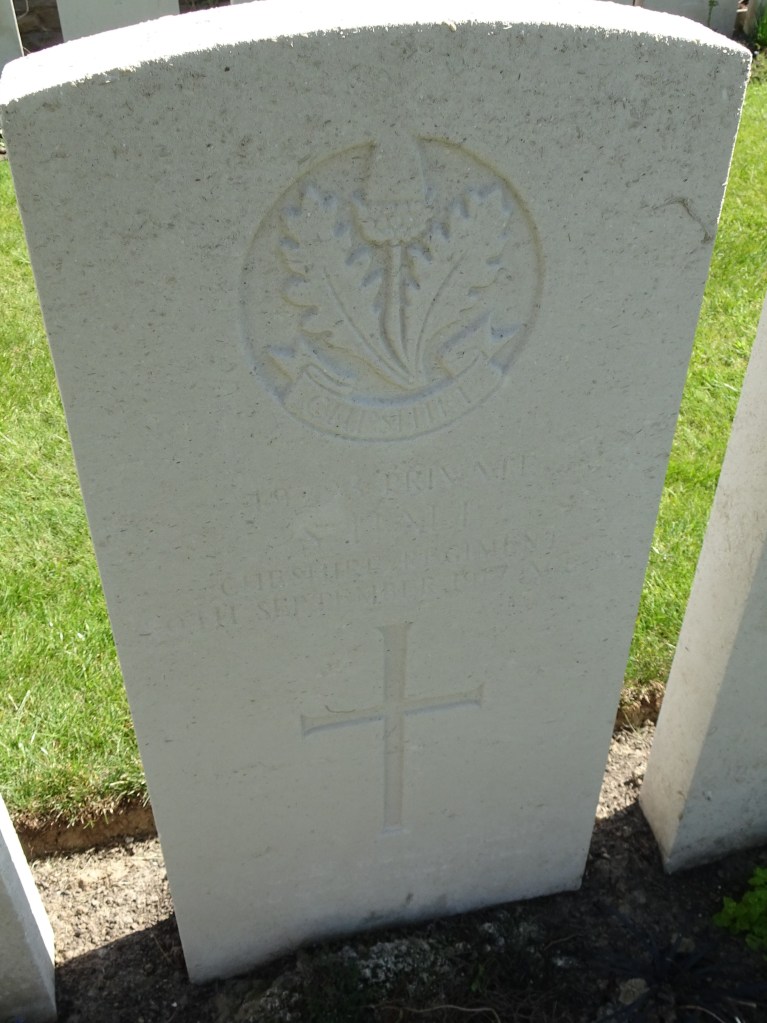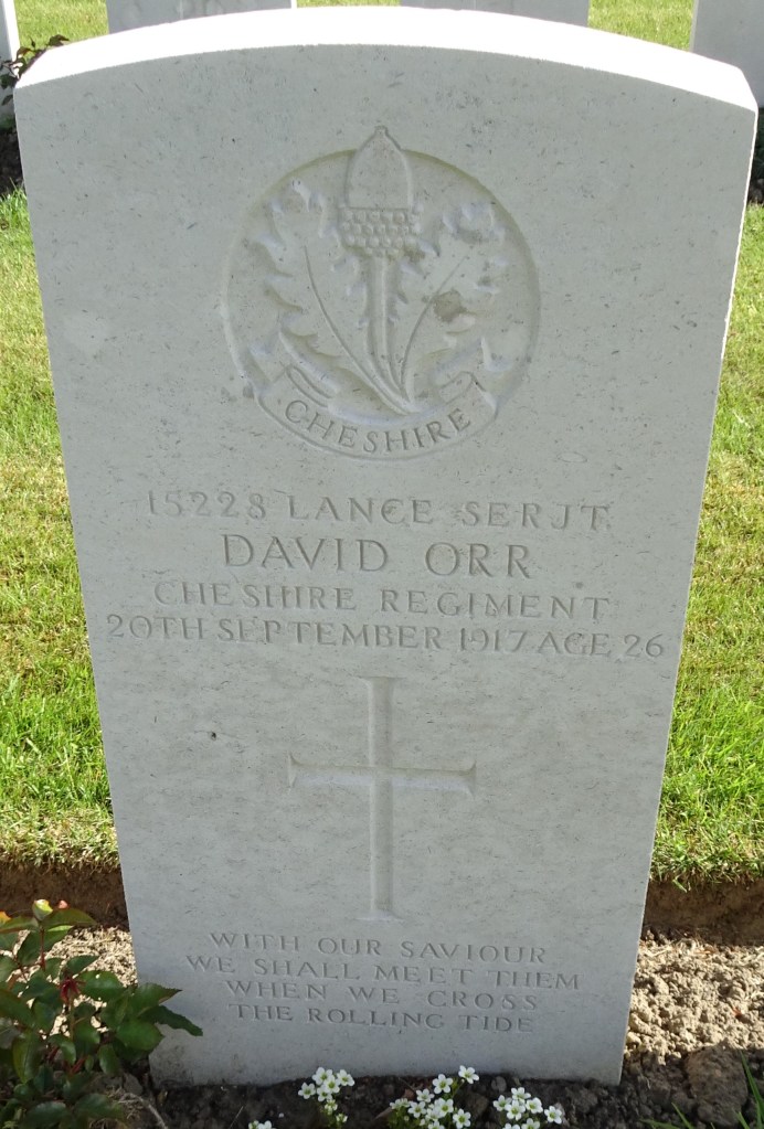 20/09/1917 Lance Serjeant David Orr (Age 26) “B” Coy. 9th Bn. Hooge Crater Cemetery, West-Vlaanderen Belgium. ‘15228’ Son of David and Sarah Orr, of go, School St., Cheadle Heath, Stockport.