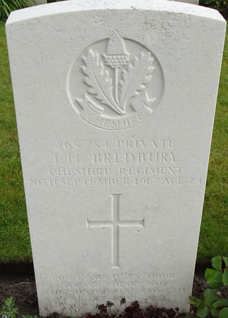 20/09/1917 Private James Henry Bredbury (Age 24) 1st/6th Bn. Bedford House Cemetery, West-Vlaanderen Belgium. ‘265784’ Husband of Annie Maria Spalding (formerly Bredbury), of 4, Owen St., Chestergate, Stockport.