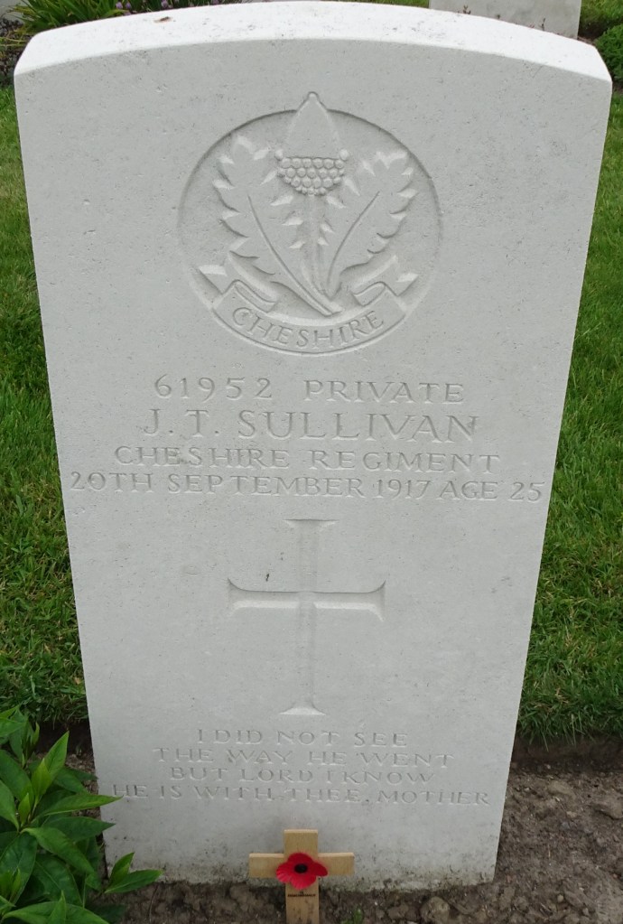20/09/1917 Private John Timothy Sullivan (Age 25) 6th Bn. Tyne Cot Cemetery, West-Vlaanderen Belgium. ‘61952’ Son of John and Johannah Sullivan, of 21, Standard St., New Kent Rd., London.