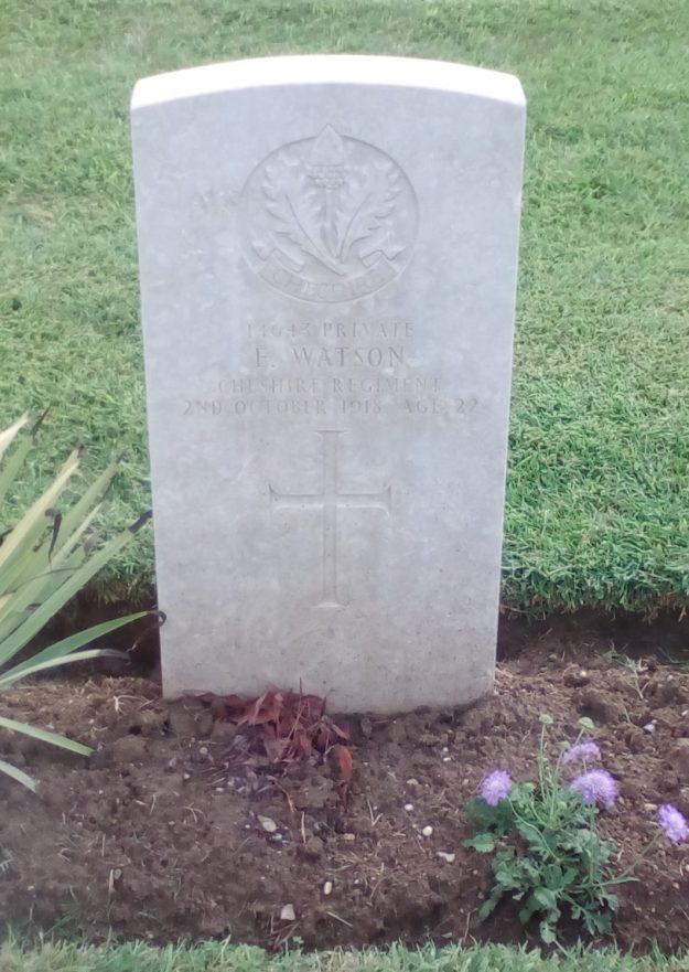 2/10/1918 Private Ernest Watson (Age 22) 12th Bn. Mikra British Cemetery, Kalamaria, Greece. ‘14643’ Son of Mrs. E. Watson, of 1 5, Mellor st Carrington Rd., Stockport. (pic from findagrave.com. – with thanks)