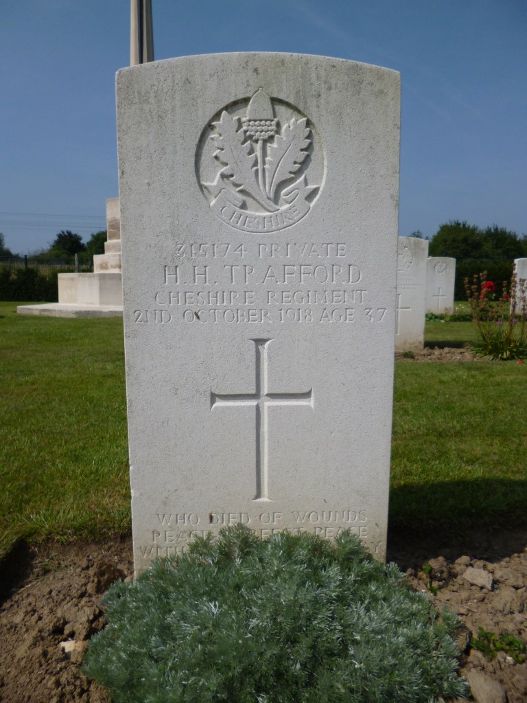 2/10/1918 Private Henry Herbert Trafford (Age 37) “D” Coy. 23rd Bn. Le Grand Beaumart British Cemetery, Steenwerck, Nord France. ‘315174’ Husband of Margaret Trafford, of Sollom, Tarleton, Preston. (pic from findagrave.com – with thanks)