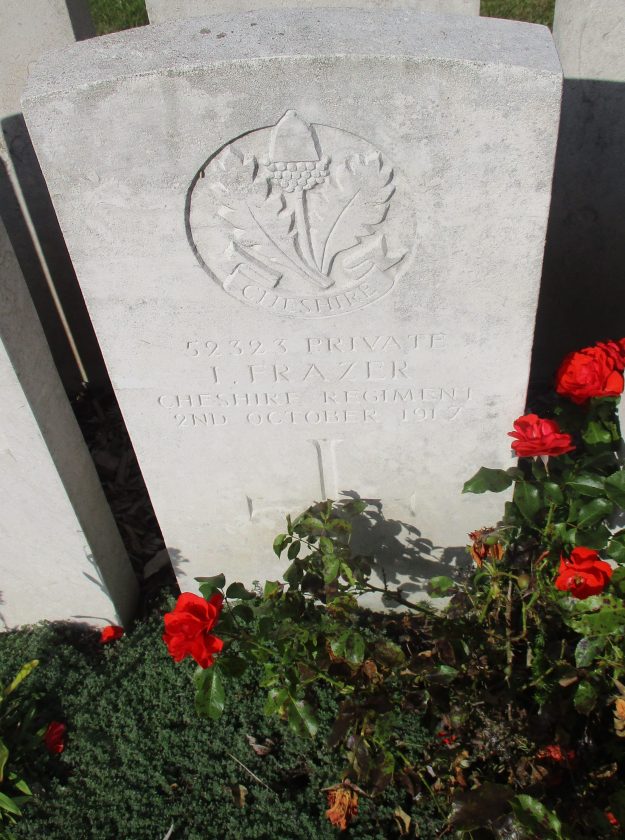 2/10/1917 Private Issac Frazer 9th Bn. Outtersteene Communal Cemetery Extension, Bailleul, Nord France. ‘52323’ (pic from findagrave.com – with thanks)