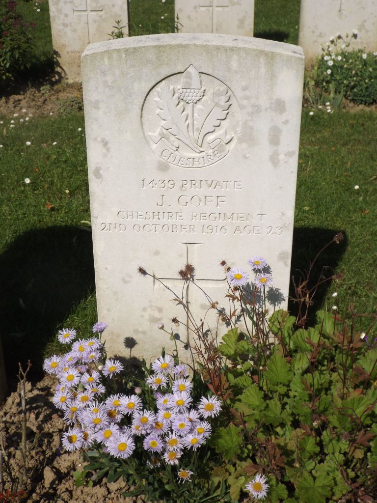 2/10/1916 Private James Goff (Age 23) 1st/5th Bn. Delville Wood Cemetery, Longueval, Somme France. ‘1439’ Son of James and Harriet Goff. Native of Chester. (pic from findagrave.com – with thanks)