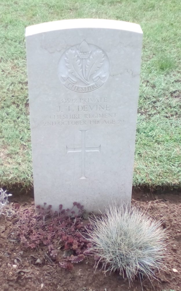 2/10/1918 Private James Thomas Devine (Age 29) 2nd Bn. Mikra British Cemetery, Kalamaria, Greece. ‘33592’ (pic from findagrave.com. – with thanks)