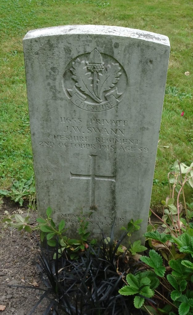 2/10/1915 Private John William Swann (Age 39) “B” Coy. 11th Bn. Rifle House Cemetery, Hainaut Belgium. ‘11655’ Husband of Ann Swann, of 6, Hayfield St., Portwood, Stockport.