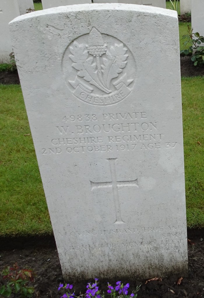2/10/1917 Private William Broughton 9th Bn. Oxford Road Cemetery, West-Vlaanderen Belgium. ‘49838’ Husband of Martha Broughton, of 14, Princes Rd., Ellesmere Port, Birkenhead.