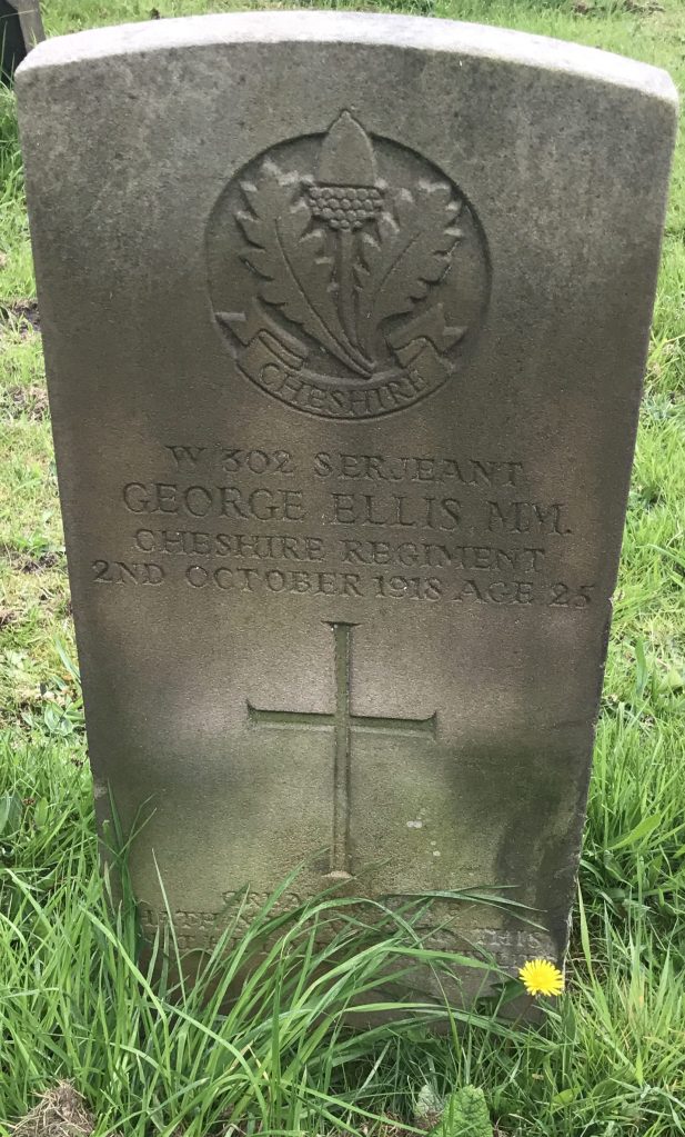 2/10/1918 Serjeant George Ellis (Age 25) MM 13th Bn. Birkenhead (Flaybrick Hill) Cemetery, Cheshire United Kingdom. ‘W/302’ Son of George and Mary Jane Ellis. Born at Birkenhead. (pic from findagrave.com. – with thanks)