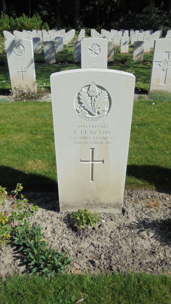 2/10/1916 Private Fred Clayton 1st Bn. Cologne Southern Cemetery, Nordrhein-Westfalen Germany. ‘9034’ (pic from findagrave.com – with thanks)